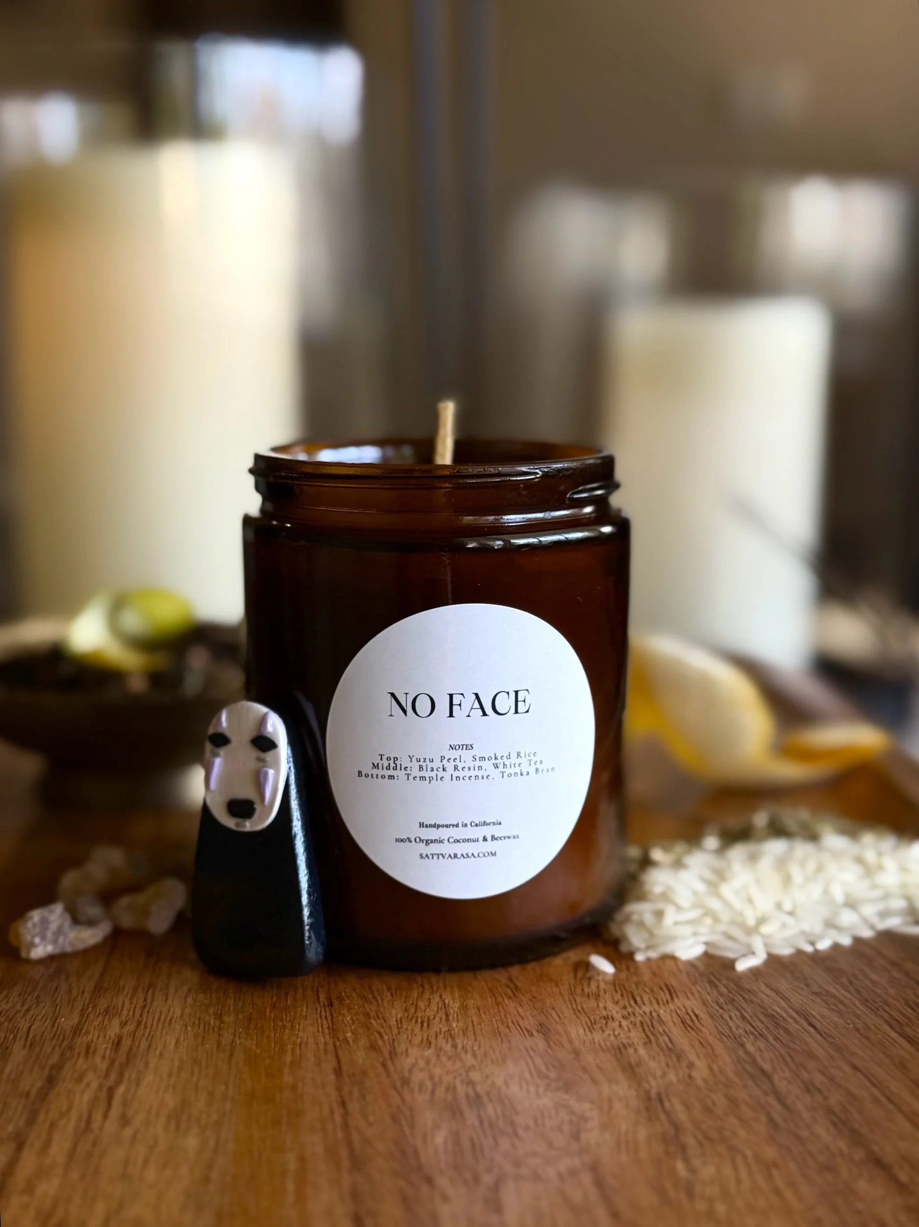 Each 8 oz. candle comes with a handmade No Face clay magnet, sculpted, painted, and finished by hand.